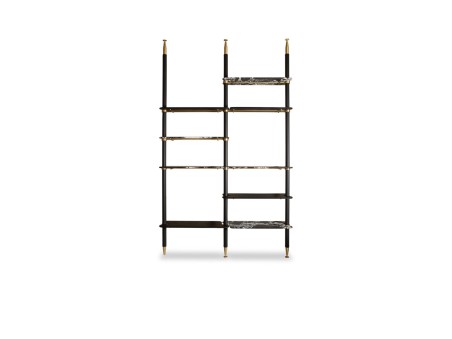 The Lloyd bookcase by Baxter consists of a tubular aluminum support structure veneered in brushed oak stained in different shades. It is possible to fasten the bookcase to the ceiling or wall using satin-finished brass or burnished brass pins. Lloyd is a bookcase enhanced with shelves made of stone with water-repellent protective oil or solid brushed oak stained in different shades. Finally, shelf supports in satin-finished brass or burnished brass add an extra touch of class.