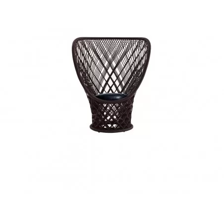 Pavo Real è una poltrona che rivisita le grandi poltrone in rattan e midollino, diffuse nei paesi del sud-est asiatico. I volumi si dilatano, gli intrecci si raddoppiano, il decoro compare inaspettato e garbatamente gestito per frammenti. Solo per uso interno, Pavo Real aggiunge un elegante dettaglio esotico. Struttura in acciaio verniciato, rivestita in midollino di colore marrone. Cuscino di seduta con imbottitura e rivestimento in pelle nera.