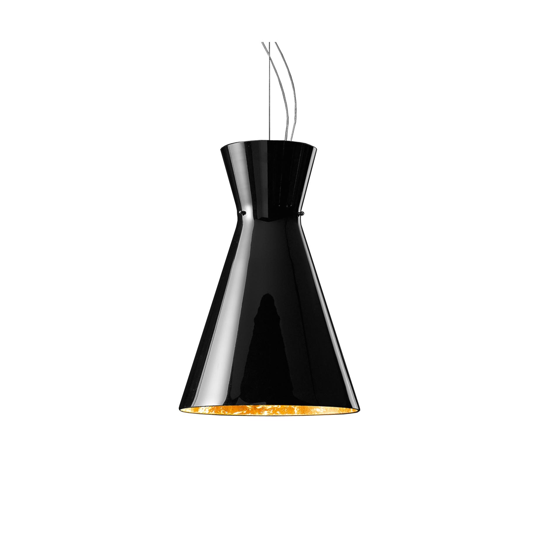 Polished black lacquered metal fitting. Glass shade available in black-gold leaf color. Bulb clear halogen HSGSA/C/UB 77W or 150W with E27 base. Bulb halogen PAR 30 HAGS/UB 75W with E27 base. Bulb fluorescent 30W with E27 base. Bulb Led with E27 base.