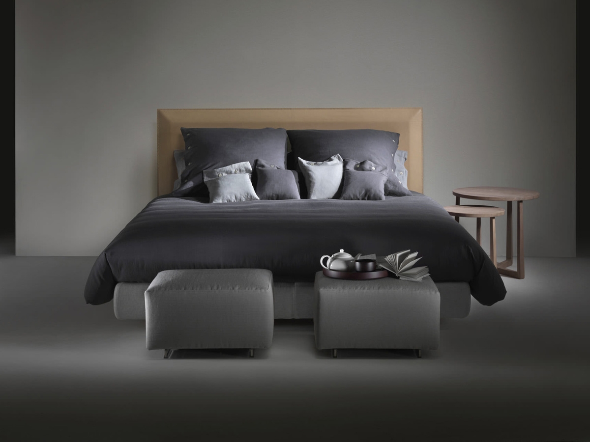 Eden by Flexform is an elegant double bed, extremely comfortable. Base with platform fitted with wooden flats, adjustable at different heights. The wooden base is upholstered in fabric or leather. Removable. It is possible to have it also with storage. Mattress not included.
