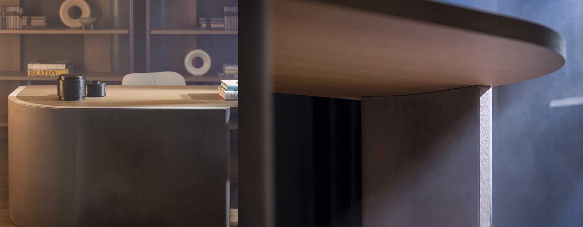 Denken Sie darüber nach, Ihr eigenes Eckstudio einzurichten? Baxter bietet den Joni-Schreibtisch in seiner neuen Kollektion 2022 an: ein Möbelstück mit starker szenischer Präsenz, aber mit minimalistischem Design, das sich durch klare Formen auszeichnet. Die breite Holzplatte ruht auf zwei Beinen, von denen eines eine geschwungene Form hat, die ein gemütliches, einhüllendes Design schafft. Die Schubladen sind unverzichtbar, um Dokumente zu verstauen und Ordnung zu halten. Perfekt für die Platzierung in der Mitte des Raums oder sogar in einem Arbeitsbereich, der im Wohnbereich des Hauses eingerichtet werden soll.
