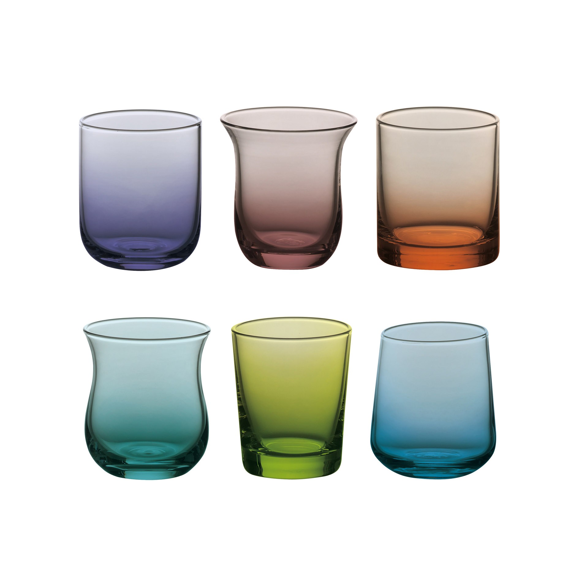 Diseguale by Bitossi is a set of six shot glasses made of mixed shapes and colors. Dishwasher safe.