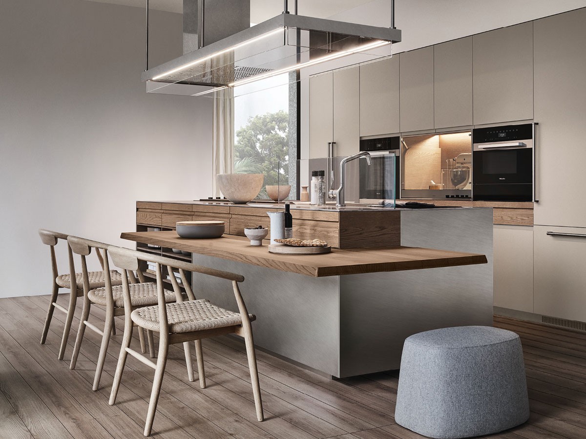 Wenn Sie Ihre Küche erneuern möchten, empfiehlt Ihnen das Mobilificio Marchese das Convivium von Arclinea. Die Küche ist das Zentrum der täglichen Aktivitäten der Familie, in der stundenlang Gerichte zubereitet und gekocht werden, um sie mit Eltern und Freunden zu teilen. Convivium zeichnet sich durch eine kompakte Insel mit essentiellem Design aus, die sich durch eine schlanke Arbeitsplatte mit Stauraum und Convivium Elegant-Türen aus Edelstahl Vintage auszeichnet. Letztere werden von Hand gefertigt und haben einen warmen" Look, der ideal zum fossilen Eichenholz des Snacktisches, des offenen Schranks und der integrierten Schubladen passt.