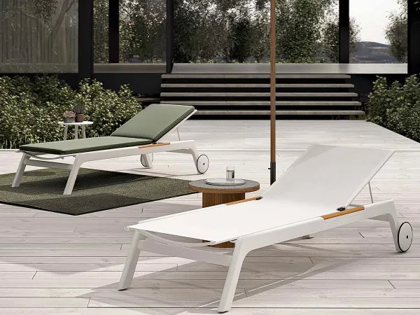 Mit ihrem klaren, reinen und zeitlosen Design zeichnet sich Nevada durch ihre Teakholzeinsätze aus, die der minimalistischen Struktur eine zusätzliche Note verleihen. Nevada ist eine Liege aus graphitfarbenem oder weißem Aluminium, die sich für jede Art von Umgebung eignet, sei es im Wohn- oder im Objektbereich.