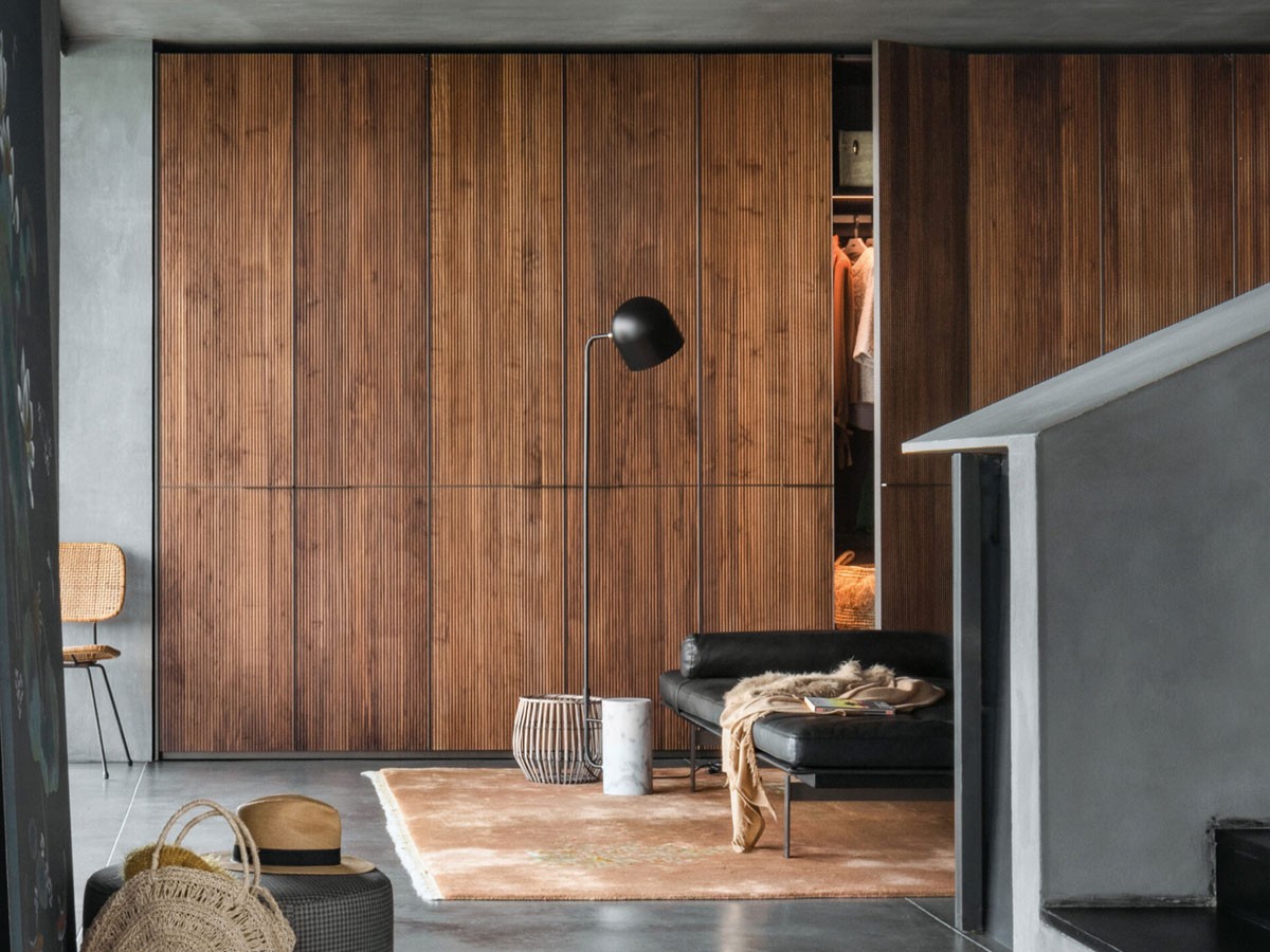 Der Kleiderschrank Seryasse von Lema ist eine hochwertige Lösung, die das Konzept des maßgefertigten Schranks mit einer raffinierten und zeitlosen Ästhetik interpretiert. Entworfen von David Lopez Quincoces, zeichnet er sich durch seine Drehtüren aus Canaletto-Nussbaum mit vertikaler Mikro-Lamellenstruktur aus, die einen eleganten dreidimensionalen Boiserie-Effekt erzeugt. Ein Design-Kleiderschrank für den Schlafbereich, der sich jedoch auch ideal zur Aufwertung anderer Wohnbereiche eignet.