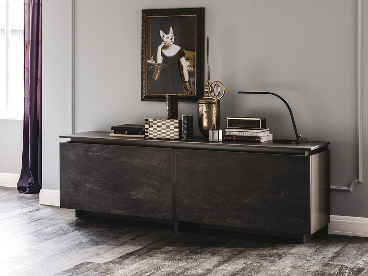 Europa Keramik Sideboard has essential design but perfect in all details. It is a great solution to furnish a modern area. Structure in graphite chipboard panel. Sliding doors in ceramic. Inner shelves in tempered transparent glass. Contact us to choose the perfect finishes for your home.