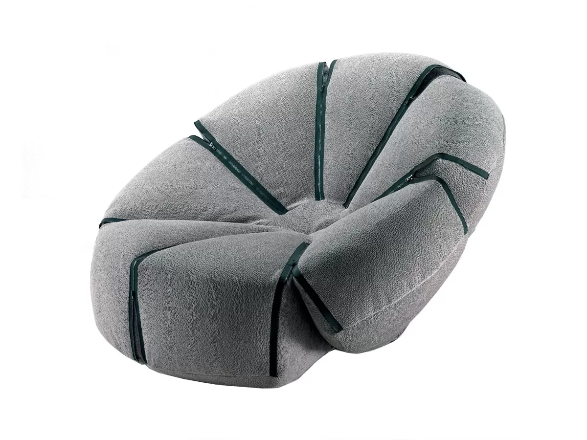 LOL:) is young, fresh and informal like the chat language, where acronyms evolve and change quickly. Its form reminds you of a semi-closed flower, in which petals are tied together by large zips. Lively and cheerful with strong colors or daring contrast; cool and trendy with elegant tone on tone fabrics.