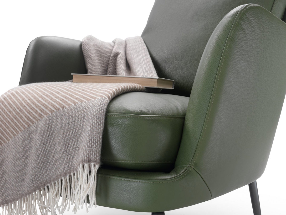 Bei einer besonderen Version des Sessels stützt die Metallstruktur die Schale mit einem lederbezogenen Detail, das als Griff fungiert und die Bewegung des Sessels erleichtert. Um Ihren Marley-Sessel noch persönlicher zu gestalten, können Sie die Art der Polsterung wählen.