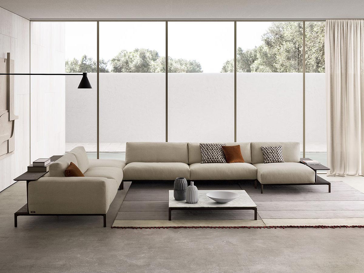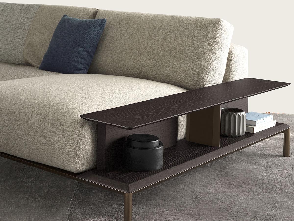 Jedes Modul kann mit edlen Couchtischen mit Marmor- oder Glasplatten, mit Hockern, die mit den Sitzen kombiniert werden können, um dekonstruierte Designs zu schaffen, oder mit einem Bücherregal hinter der Rückenlehne oder an der Seite des Chaiselongue-Sitzes, das die Armlehne ersetzt, ergänzt werden.