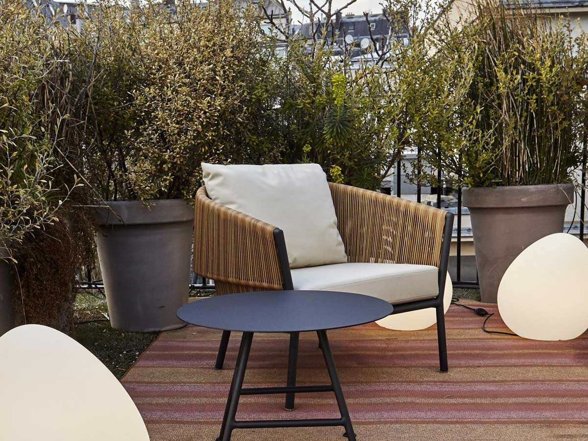 Der Sessel Lapel von Ligne Roset, entworfen von Manuela Busetti und Andrea Garuti, ist ein Möbelstück, das eine angenehme Entspannung im Freien ermöglicht. Der Sessel Lapel zeichnet sich durch eine umklappbare, kragenförmige Rückenlehne aus und verleiht den Außenbereichen Ihres Hauses einen einzigartigen Stil und eine einzigartige Unterstützung. Der leichte Komfort, den Lapel ausstrahlt, wird durch das Aluminiumgestell und die Rückenlehne aus synthetischer Rattanfaser gewährleistet.