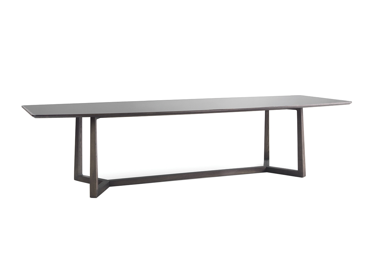 Gipsy table by Flexform has a rigorous and sophisticated design. The particular structure in solid wood and square legs fastened to the base with an intriguing geometric stratagem make it unique. Top available in wood or glass. It is possible to have it in different sizes and shapes.