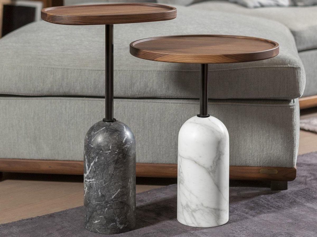 Möchten Sie Ihre Einrichtung durch einen Couchtisch mit originellem Design vervollständigen? Wir empfehlen Ekero von Porada, ein Wohnaccessoire, bei dem sich Holz und Marmor zu einem perfekten Gleichgewicht vereinen. Der zylindrische Sockel aus weißem Carrara- oder grauem Carnico-Marmor trägt die Platte aus massivem Canaletta-Nussbaum und ist ein kleines Meisterwerk der Handwerkskunst Made in Italy.