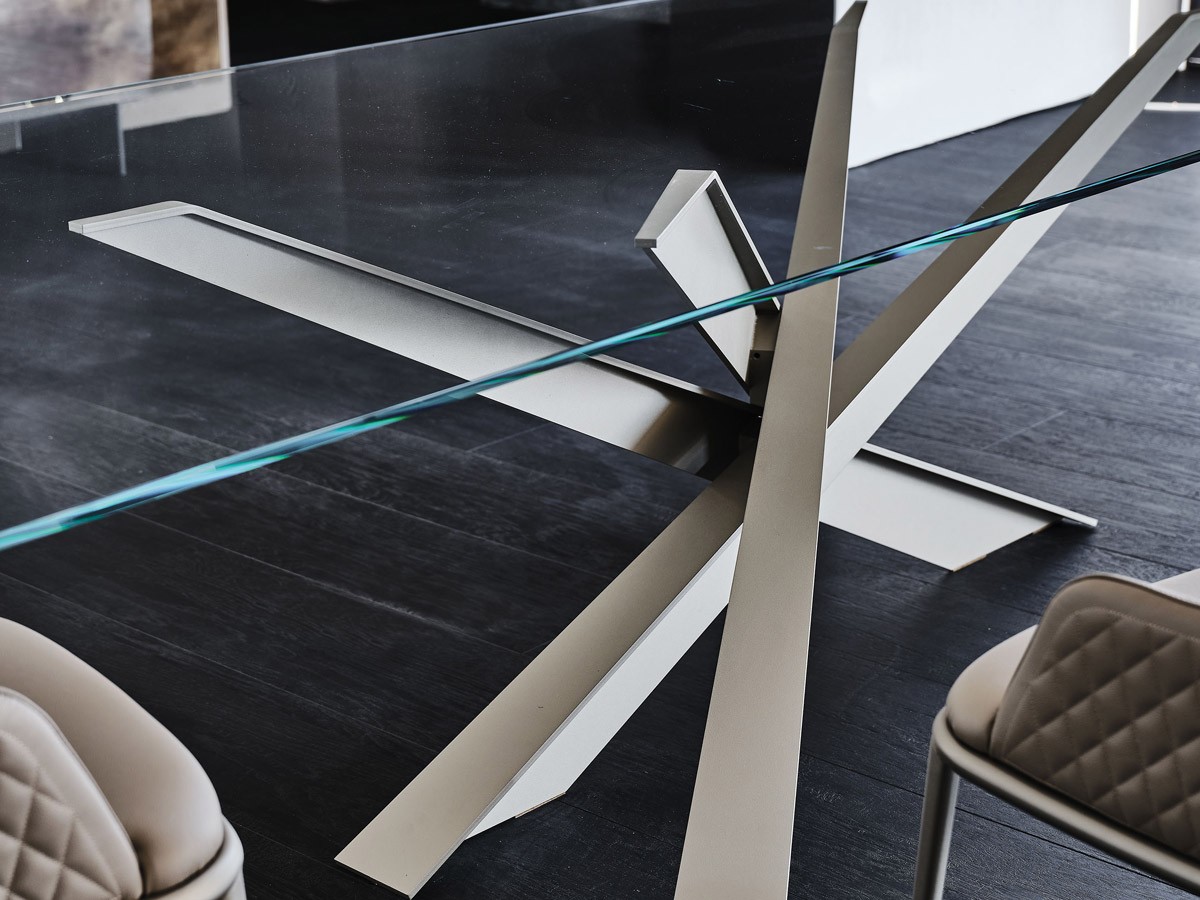 Der auf dem Salone del Mobile 2022 als Neuheit des Jahres vorgestellte Tisch Lancer von Cattelan Italia zeichnet sich durch einen skulpturalen, majestätischen und unvergleichlichen Stil aus. Der von Renato Guerra entworfene Tisch Lancer verfügt über ein Gestell mit vier Beinen, die jeweils einen T-förmigen Abschnitt aufweisen, der ein rhythmisches Hell-Dunkel-Spiel ermöglicht, bei dem die blinden Bereiche mit den Metallteilen kontrastieren. Die transparente Glasplatte schließlich erlaubt es, die skulpturale Basis in ihrer ganzen Schönheit zu betrachten.