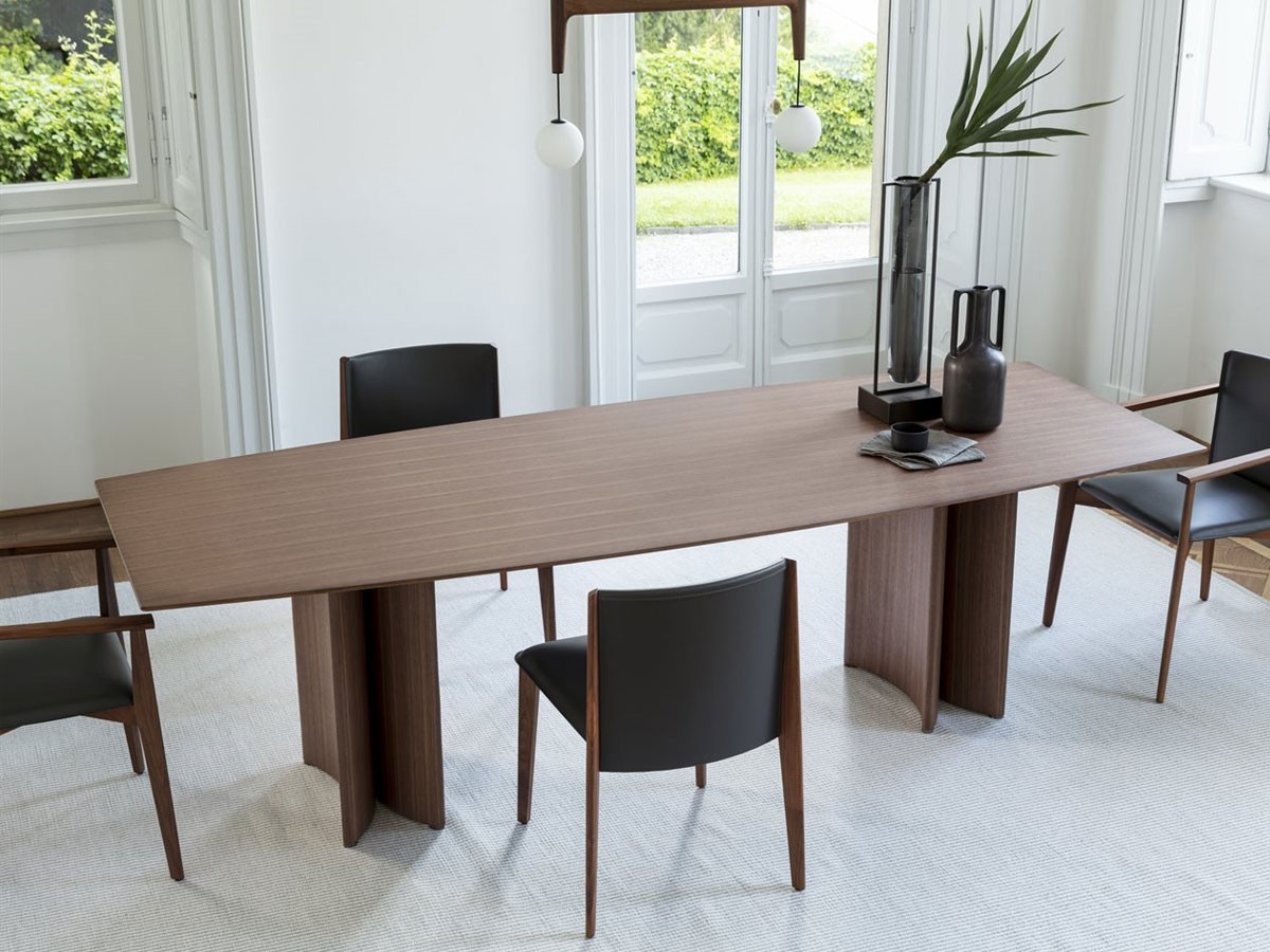Der Esstisch Alan von Porada ist ideal, um Ihre Mahlzeiten zu servieren und gleichzeitig Ihre Wohnung einzurichten. Sein starkes und raffiniertes Design macht ihn für jeden Einrichtungsstil geeignet. Alan wurde von den Designern Gabriele & Oscar Buratti entworfen und zeichnet sich durch sein Untergestell aus, das aus einzelnen halbmondförmigen Elementen aus Nussbaum Canaletta besteht, die miteinander verbunden sind, um die Basis zu bilden, die auf schwarz verchromten Metallstützen ruht. Die Platte ist individuell gestaltbar: Sie können zwischen transparentem Glas, Holz, Marmor oder Rock wählen.