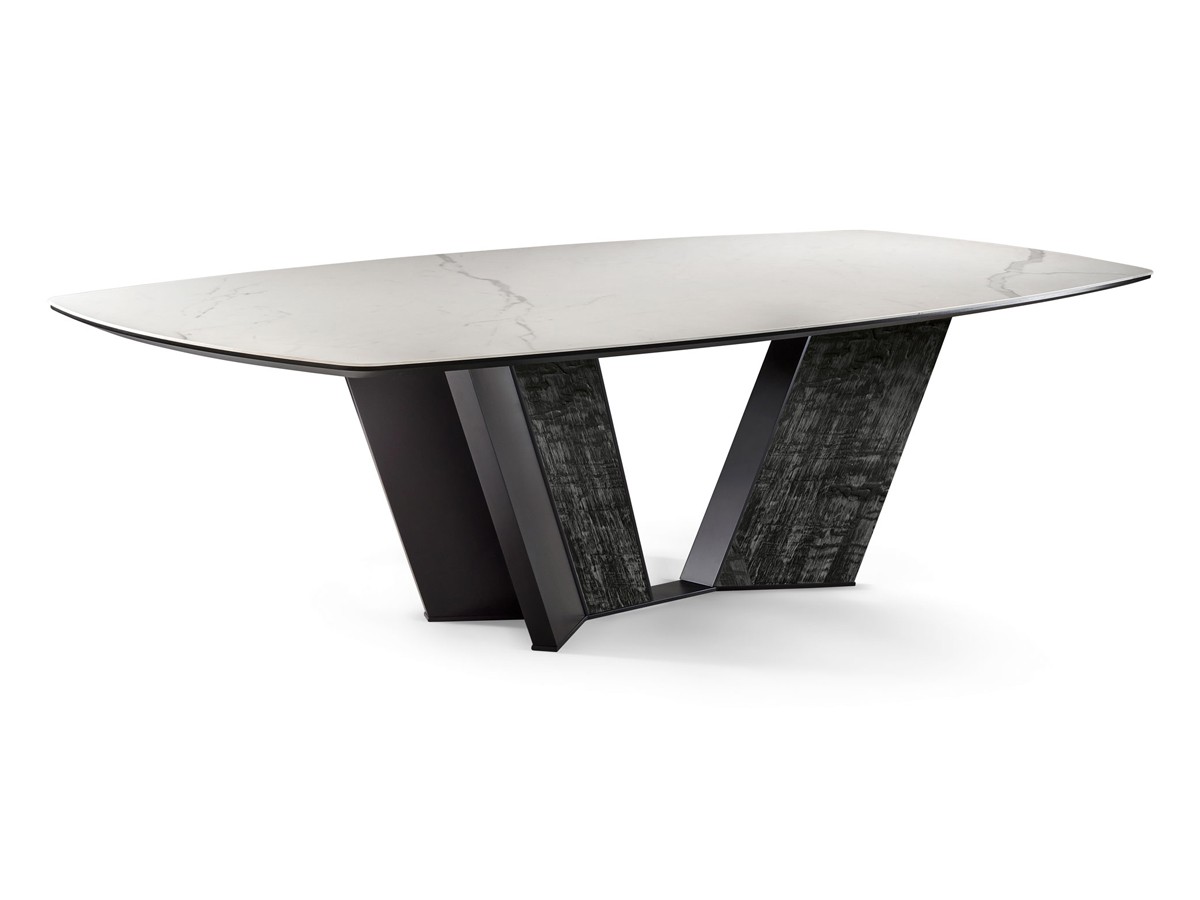 Der Tisch Prisma zeichnet sich durch ein V-förmiges Untergestell aus, das sich nach oben hin verbreitert. Das Ganze ist mit einem strukturellen Metallrahmen verbunden, der die Unterplatte aus Holz trägt. Die Platte ist aus Keramik oder Glas mit Siebdruck erhältlich, so dass Sie die Möglichkeit haben, die von Ihnen bevorzugte Variante zu wählen.
