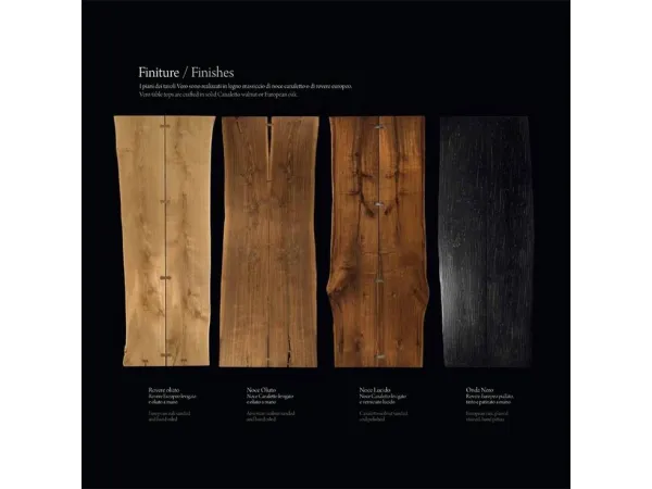The table is available in Canaletto Walnut, Oak or Polished Walnut. The base is "geometric".