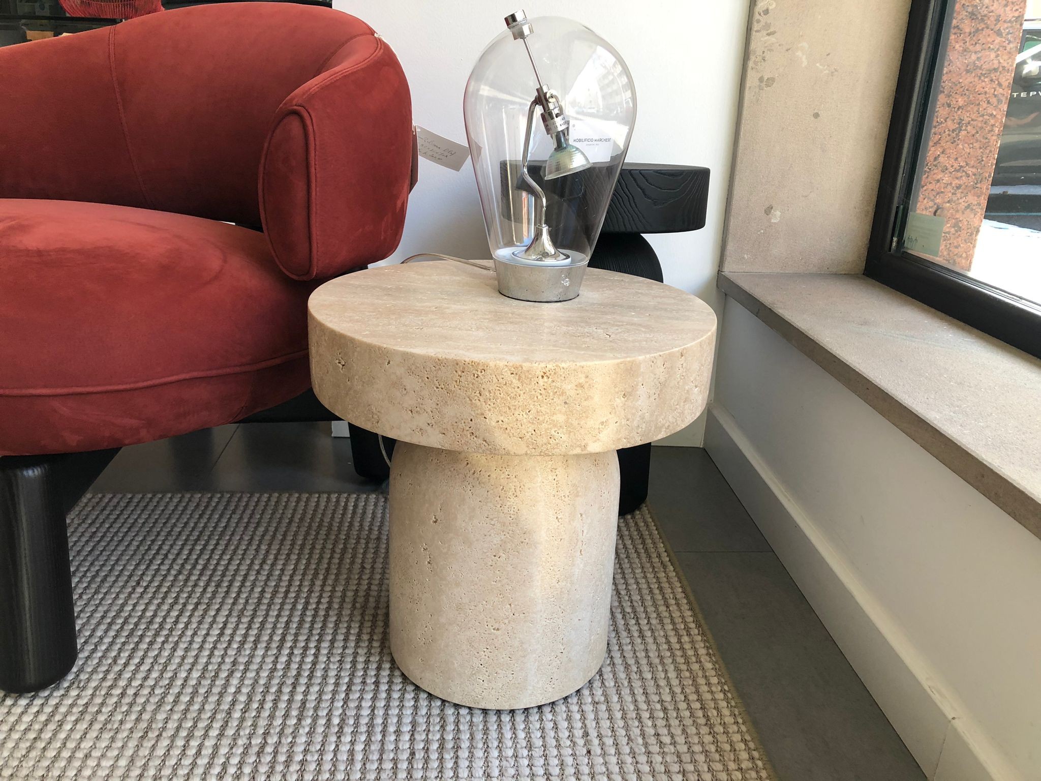 Niedriger Couchtisch: Ø40 cm x 39,5 h cm. Platte und Sockel aus mattem Travertinmarmor.