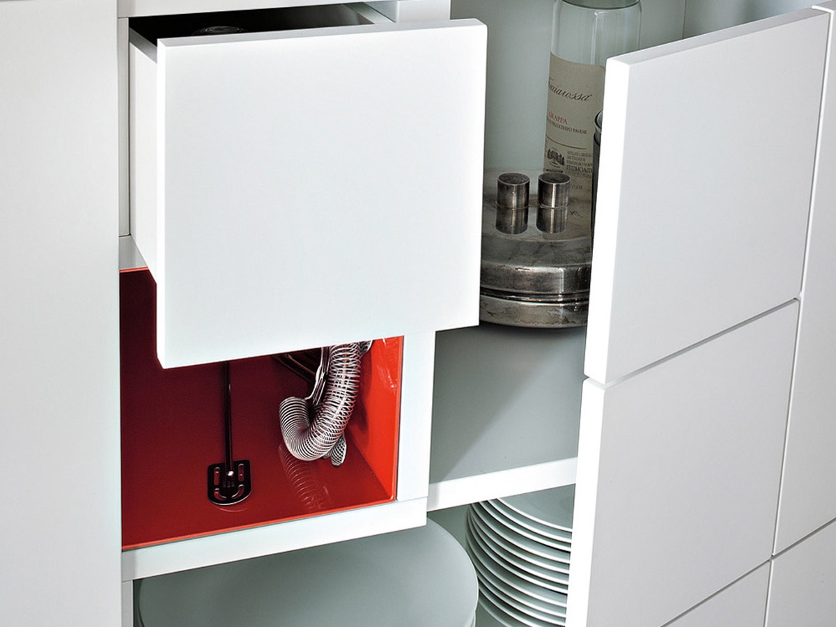 Conchiglia besteht aus Fächern, die mit lackierten Türen verschlossen sind, die durch die Verwendung von Kontrastfarben für die Türen und das Innere des Fachs individuell gestaltet werden können.