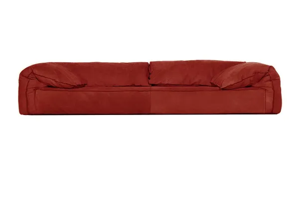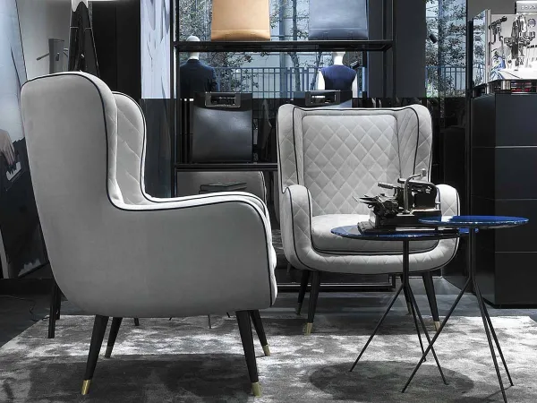 Details such as the painted iron legs with brass feet end and cushions upholstery with a special square quilting, give this armchair a classic appearance with the modern taste. Decorative piping available in the same shade of leather or all other soft leather. The one-piece frame with steel insert and the flexible cold-expanded polyurethane foam padding, highlight the excellent quality of this product.