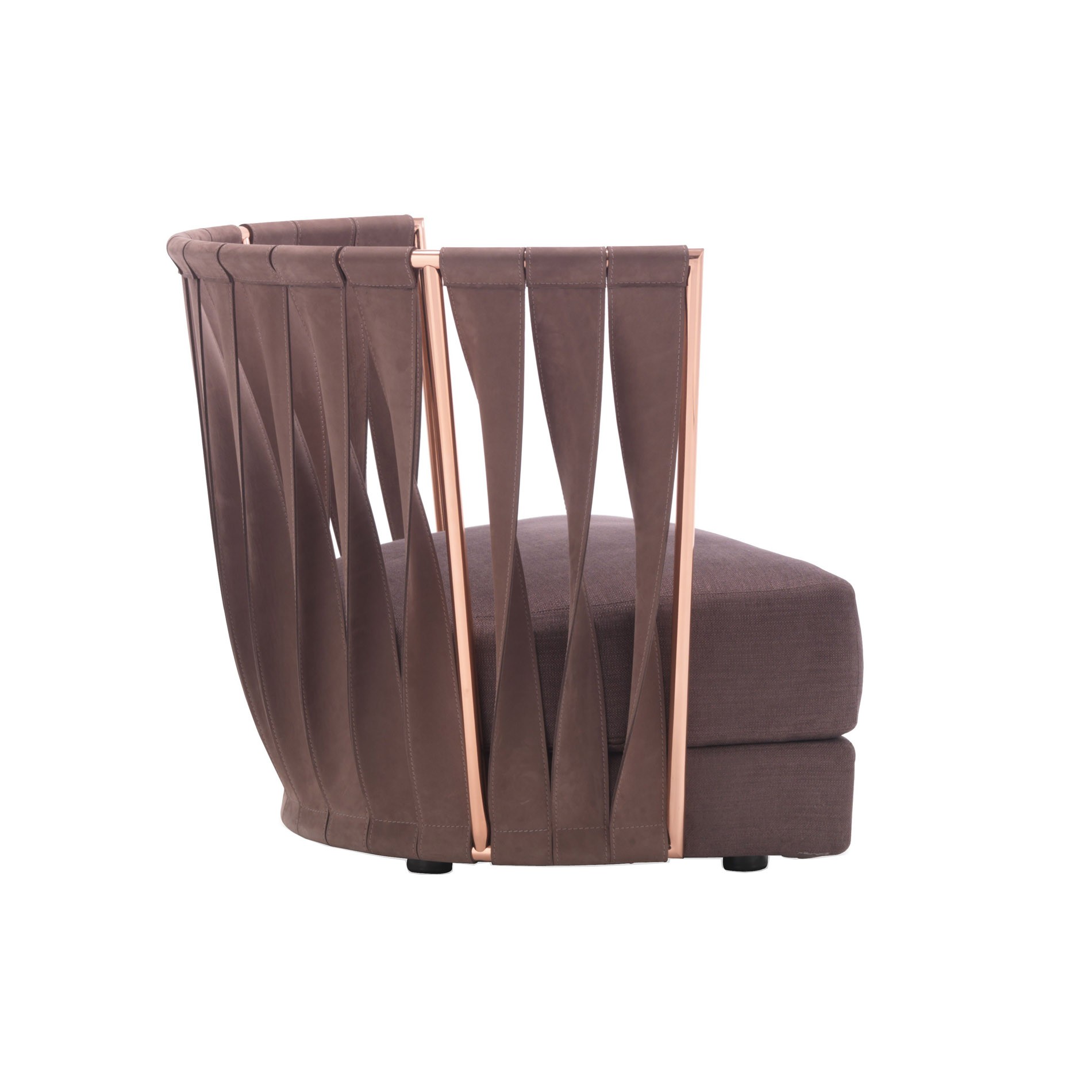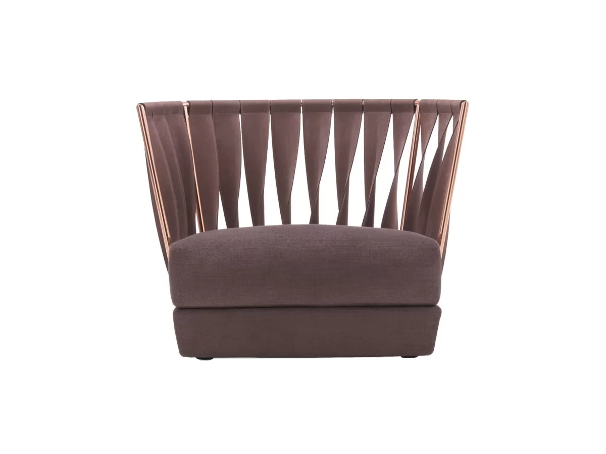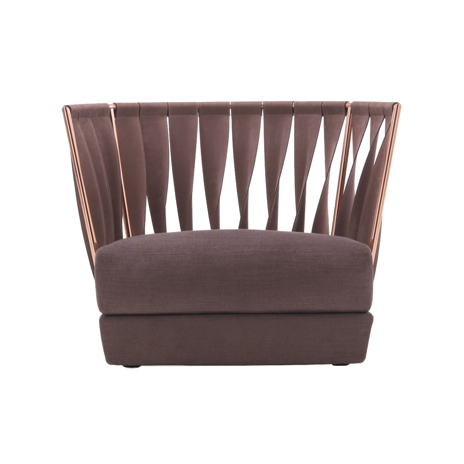 Twist is an elegant and sophisticated armchair by Cantori. The iron backrest is complemented by curved twisted leather bands that emphasize its surface. Available in different fabrics and colors.