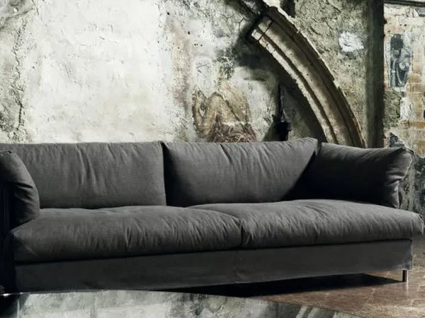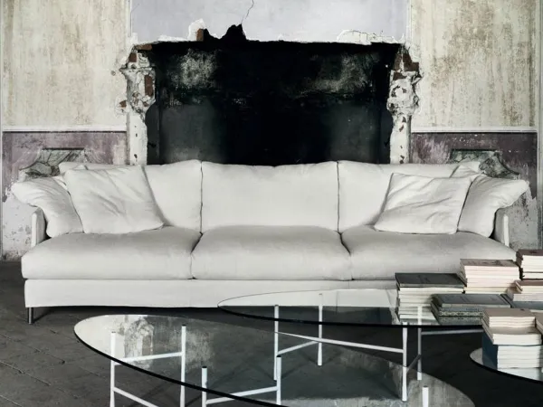 Chemise XL by Living Divani is a sofa with a modern and mininal design. It has a supporting frame in lacquered steel and a seat chassis in fir wood, with cross-woven. Seat and backrest cushions with differentiated density polyurethane foam insert coated with prewashed and sterilized goose down. Covered in fabric or leather, both fully removable by zippers and Velcro fastenings. Chemise is available in different colors and sizes.