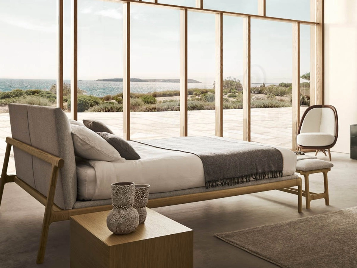 Fushimi bed by Pianca features an ash or Canaletto walnut solid wood frame, customizable in finish, which undergoes elaborate machining to make the bed comfortable and cozy. It is then milled and turned by hand to make the surfaces completely smooth and free of edges. The headboard and mattress platform are upholstered and lined and contain the structural bed base, which is made of multilayer curved beech slats.