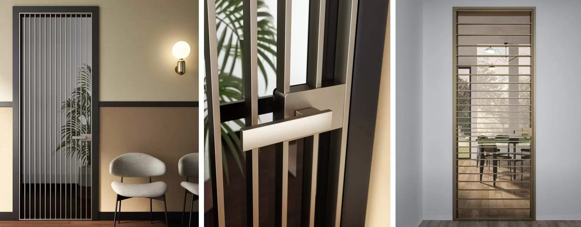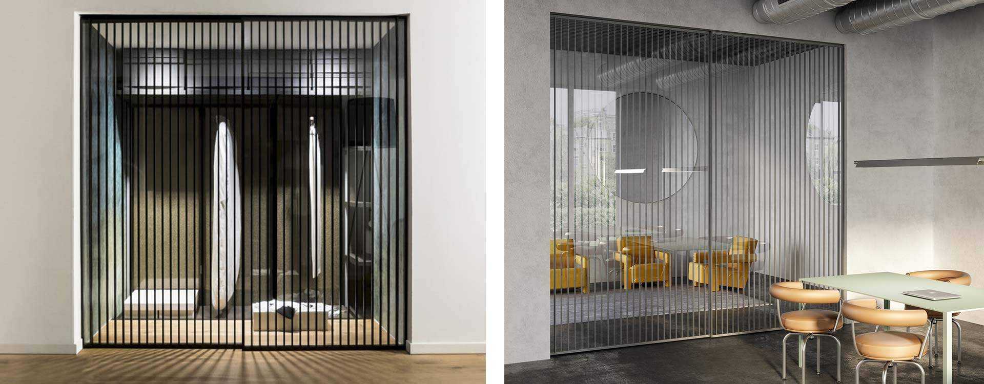 The Ri-Trait 8b system is based on the partitioning systems typical of Japanese interiors. Its minimal, light weight profile is fitted with aluminium plates that form an elegant vertical or horizontal pattern. This sophisticated solution suits contemporary design needs, from the classical hinged door version, through to large sliding walls.