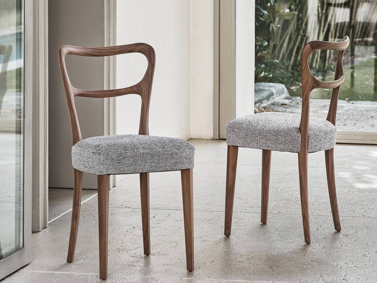 The Noemi chair by Porada features a contemporary and elegant design, softened by the curved lines of the solid walnut back. Perfect for modern environments, the Noemi chair is customizable in upholstery and ideal for furnishing your dining room. Created by designers Marelli & Molteni, the Noemi chair will add a touch of elegance to your home thanks to its refined back and minimal design, perfect for any room.