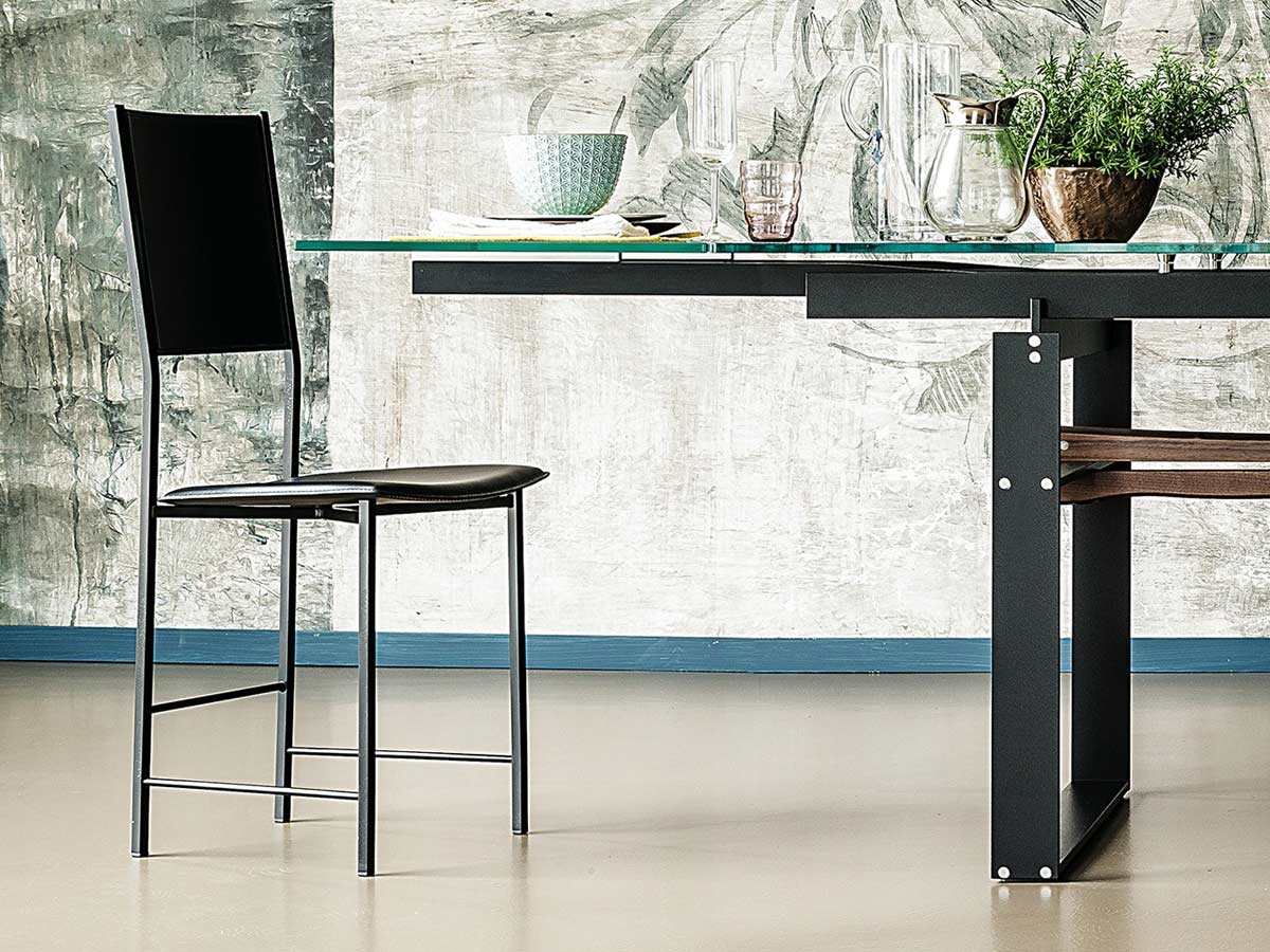 Alessia chair, by Cà Nova Design for Cattelan Italia, with slender and simple steel structure combined with leather seat and back.