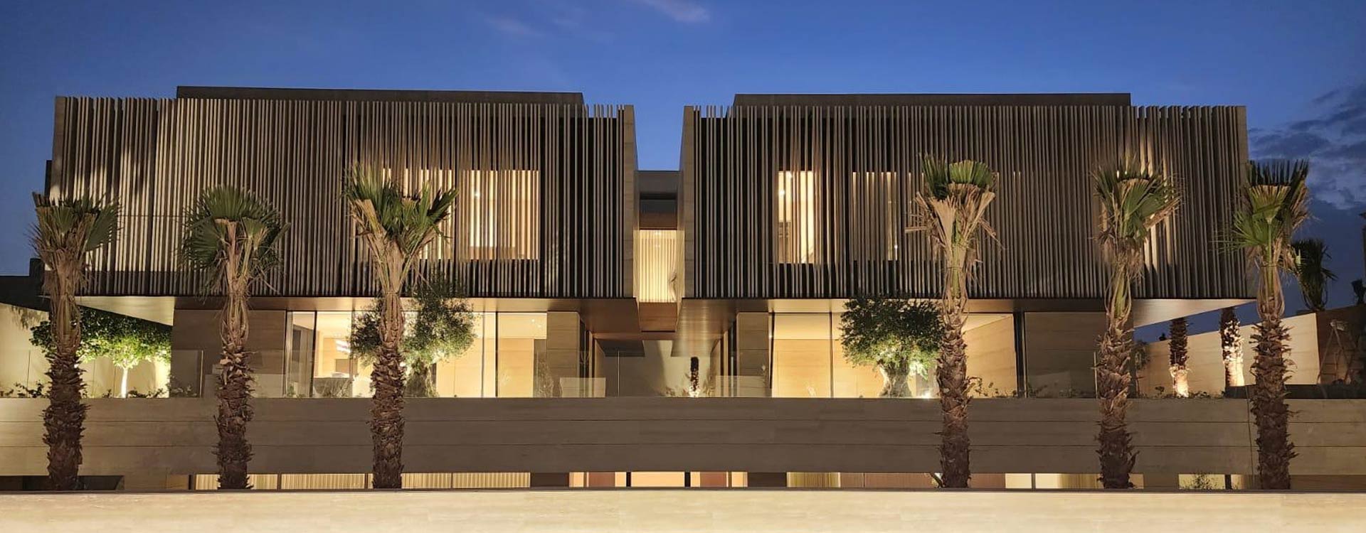 We recently had the privilege of carrying out an important interior design project in Saudi Arabia, a two-story villa that stands out for its contemporary style and attention to detail.This modern residence stands out for its minimalist and contemporary design. The main facades feature vertical louvers elements in travertine that create a dynamic effect and provide privacy without compromising natural light inside. The use of light, natural materials, combined with large glass windows and transparent railings, gives the building elegance and openness. The symmetrical arrangement of the volumes, along with the presence of palm trees and greenery, completes the composition, highlighting a balance between architectural innovation and integration with the surrounding landscape.