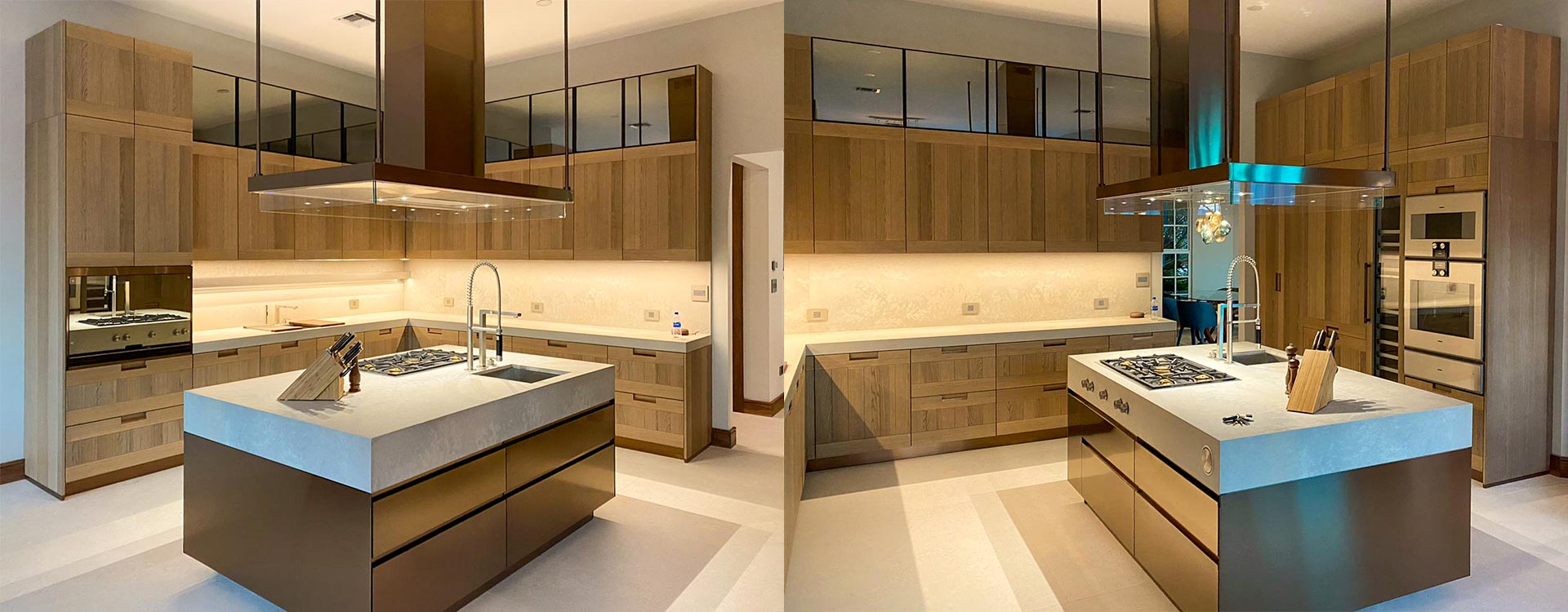 Cozy and warm, but also very rational, this Arclinea kitchen features fossil oak wood with Italia handle as its main player. A dream kitchen simply irresistible. Designed by our team of qualified architects. Focal point of the space, Convivium island with doors in bronze PVD stainless steel, worktop with recess in 20 cm thick in marble.