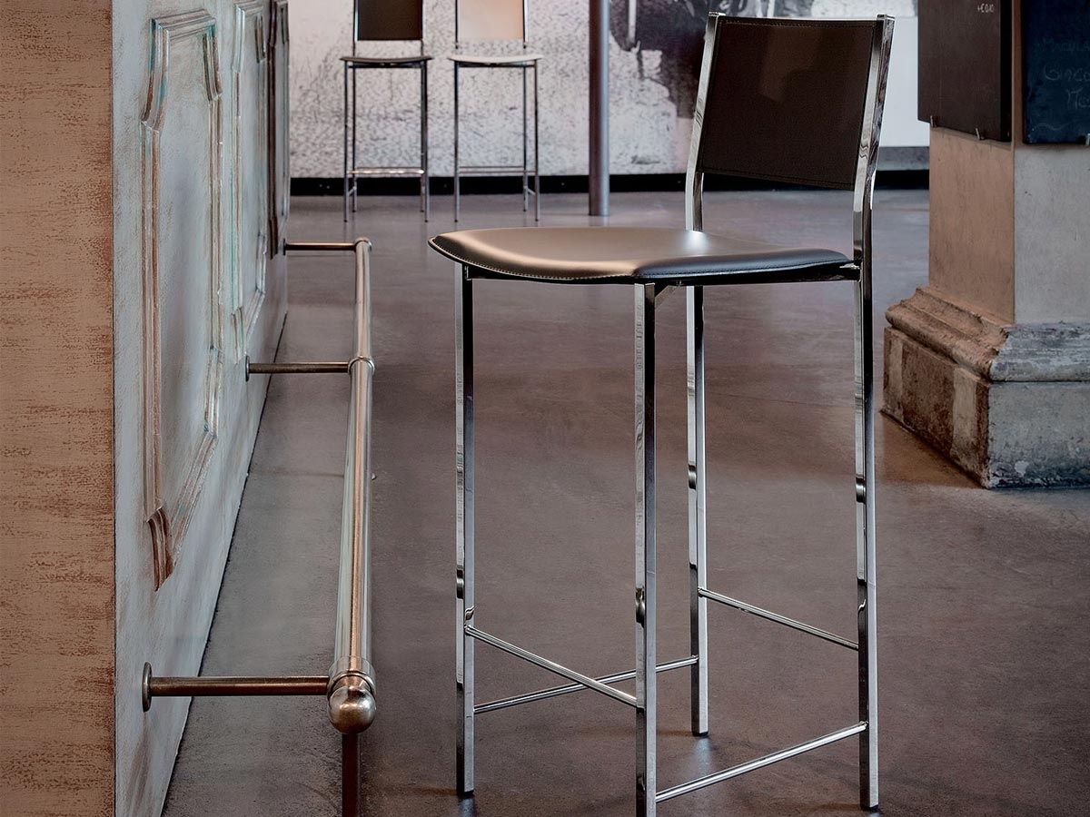 Alessio by Cattelan Italia is a modern stool with a linear design. It has a steel frame, back and seat are covered in leather. Available in different colors and finishes.