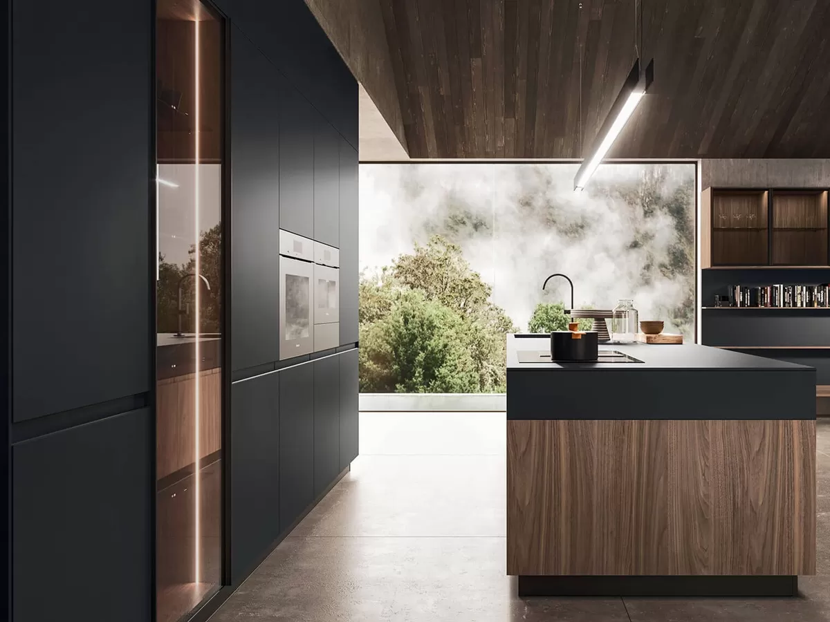 Opaque soft-touch anti-fingerprint surfaces on the kitchen island contribute to the pleasing tactile sensation. The large-sized Fenixtop hides comfortable and deep drawers inside. Internal drawers and deep drawers are organized in systems specifically designed to house cutlery, pots and all other equipment normally used in the kitchen every day.