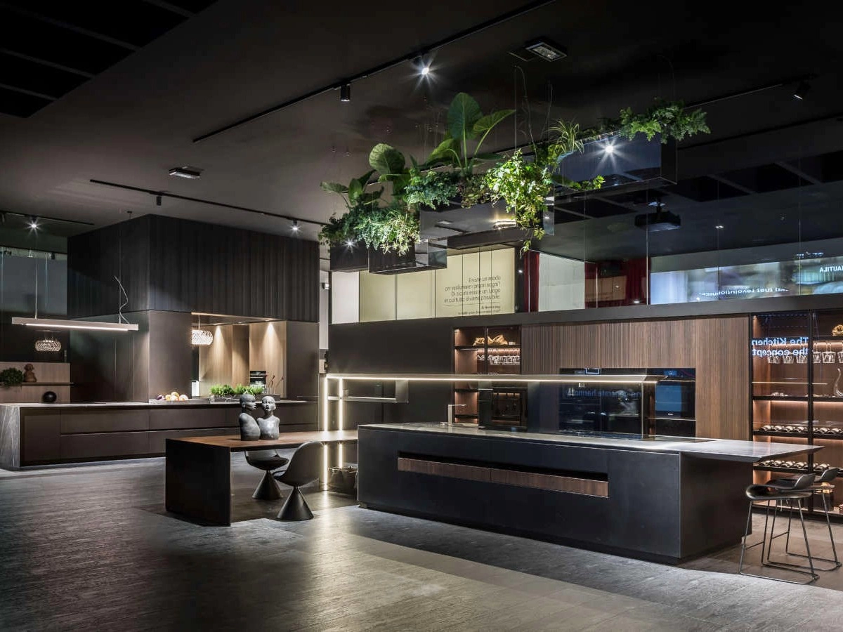 The range of accessories available is rich. Among the complements offered in the composition are the new base modules with open drawers and the GEM display cabinets in the new 120 cm modularity, equipped with new internal accessories (bottle holder, glass holder, plate holder) supported by a matt black painted aluminium frame with integrated LED lighting.