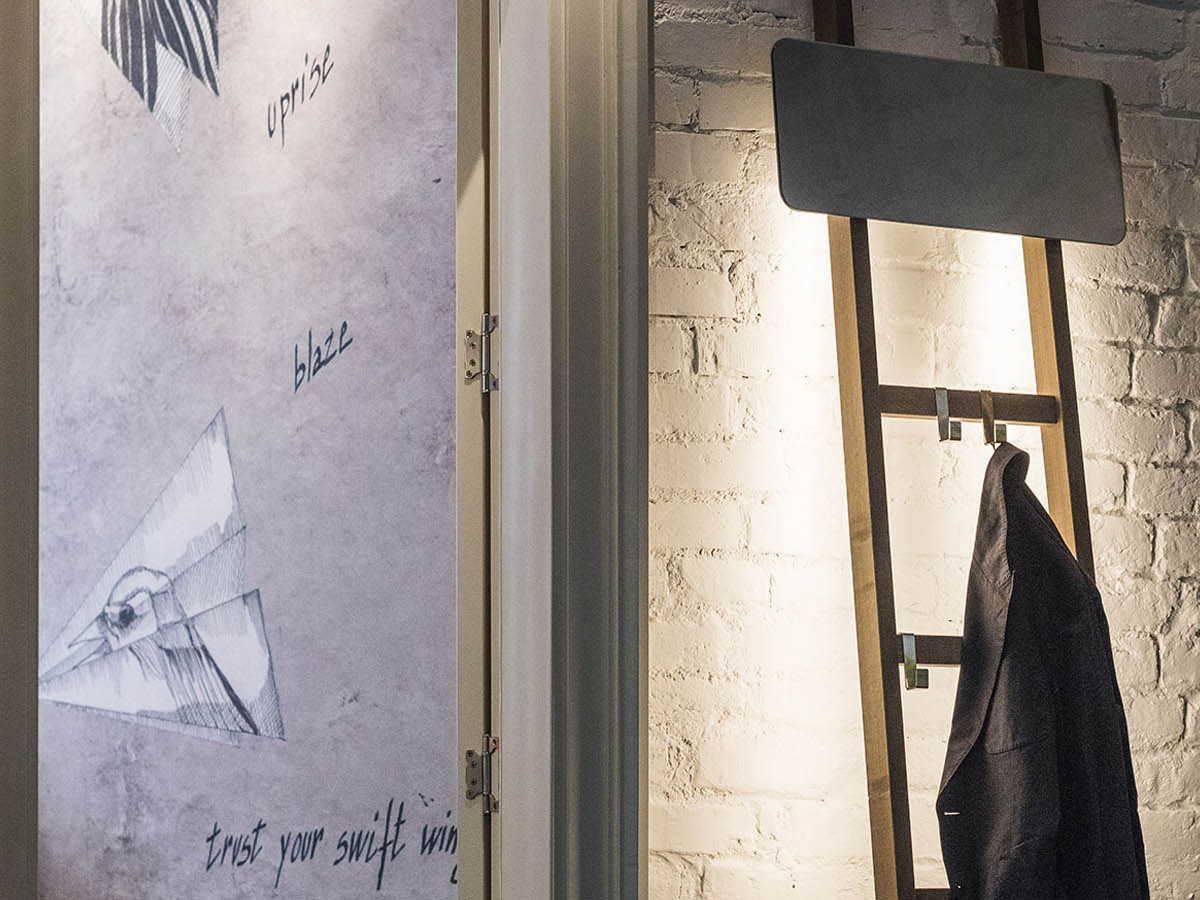 The Alla Scala Lamp by Mogg is a multifunctional piece of furniture designed by Claudio Bitetti that features an exclusive and eye-catching design. Its minimal lines are perfectly suited to any type of environment and it can be customized by adding coat hooks, small shelves and a mirror. This piece of furniture stands out for its originality and functionality: in fact, Alla Scala performs the function of a led lamp to recreate a soft atmosphere, a coat rack thanks to the hooks, but also a real ladder.