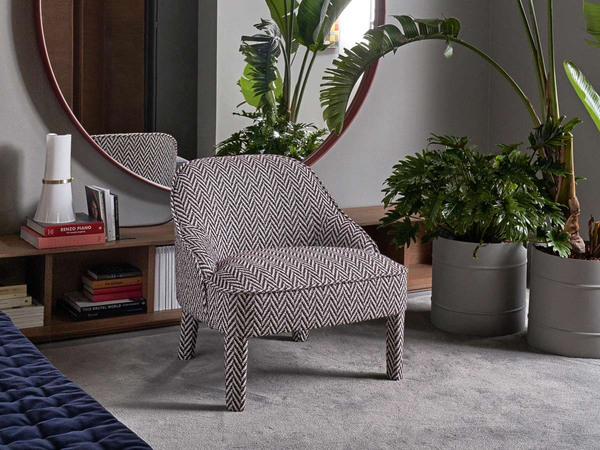 The Ida little armchair by Meridiani is a project by designer Andrea Parisio, characterised by a refined and attractive design. Thanks to its classical aesthetics, the Ida armchair by Meridiani becomes almost a homage to tradition. The entire structure rests on feet upholstered in the same fabric as the backrest and seat or made of black oak. Customise the upholstery of your small armchair by choosing the material you prefer and the finish that best suits your home.