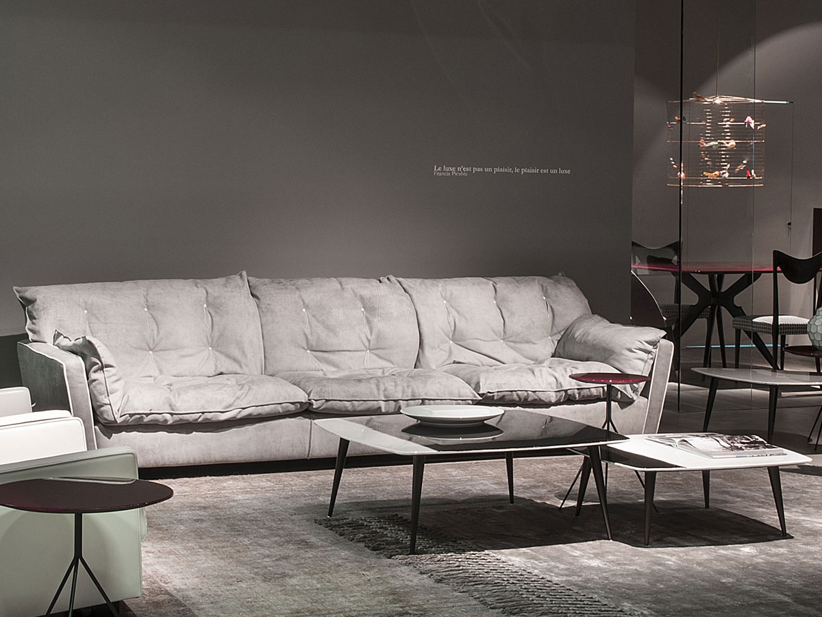 Sorrento by Baxter is an elegant sofa with a design based on the contrast between a very rigid and linear structure, enriched and filled by soft, quilted cushions. Covered in leather. Available in different colors and sizes.