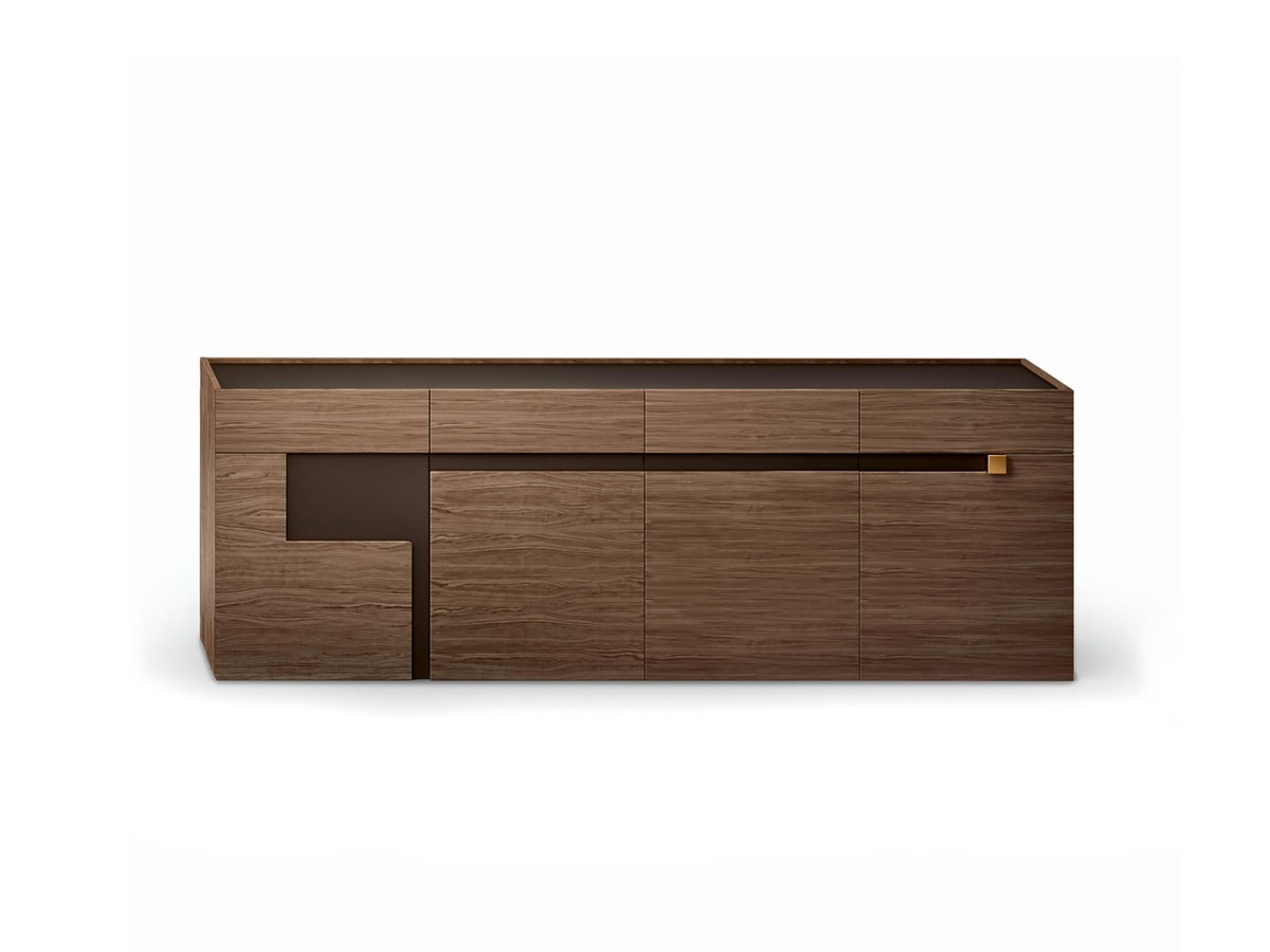 The Logos sideboard by Pianca features a structure made of wood particleboard panels in a choice of wood essence, glossy or matte lacquer, as well as the outer fronts. The interior fronts, on the other hand, are made with a layered sheet of plastic material and aluminum that is repeated in the top. The Logos sideboard is enriched with metal decorations applied to the front and the internal shelves in transparent lead tempered glass.