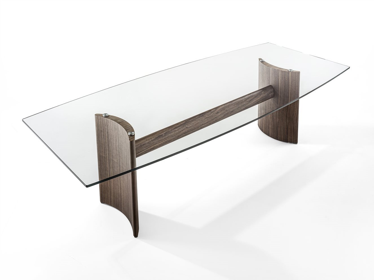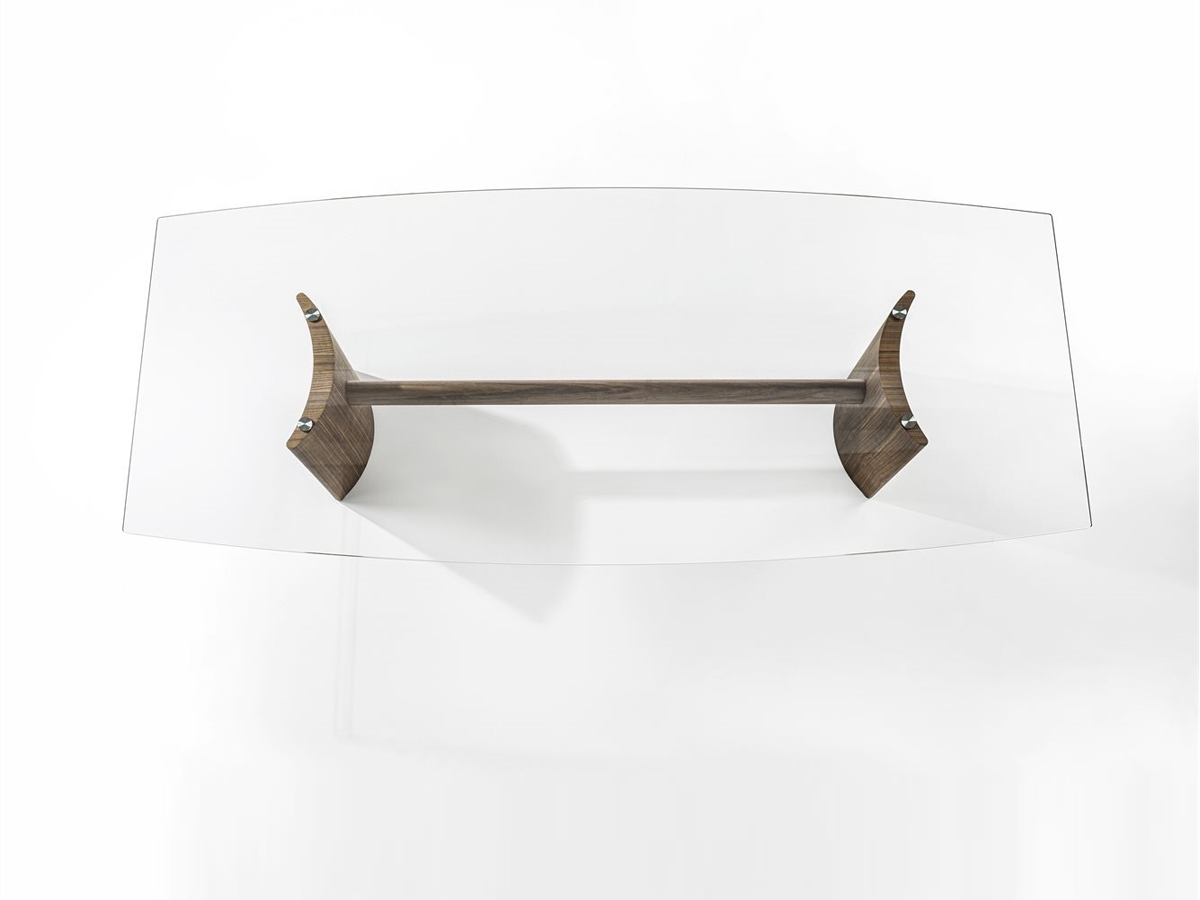 The Beam table by Porada will become your new favorite place to eat and chat with your family and friends. Designed by Gabriele and Oscar Buratti, it has two half-moon bases in canaletta walnut, joined by a central wooden beam. Transparent glass top, adds a touch of visual lightness, enhancing the beauty of the play of shapes of the base. The top is also available in wood, marble or Rock, to meet all your needs and create your new personalized table.