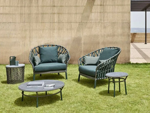 With its structure in aluminium and its synthetic fibre weave, it gives a sense of essence and it will be the protagonist of your summer days. Small but powerful: this is the perfect description of the Emma Cross Small Table.