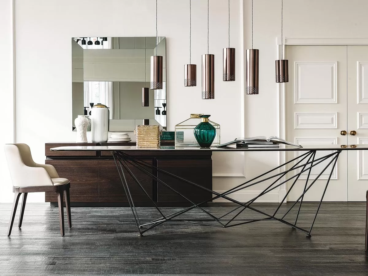 The Gordon table is the perfect match of metal and cristal. The geometric and unique base and the essential top create a perfect balance of materials and shapes. An element of furniture born to be the star of your dining room.