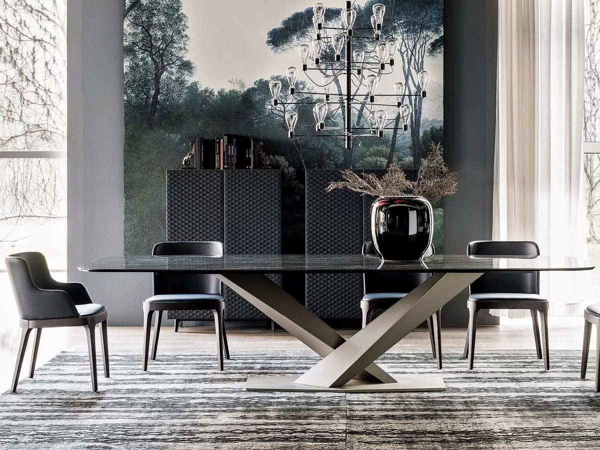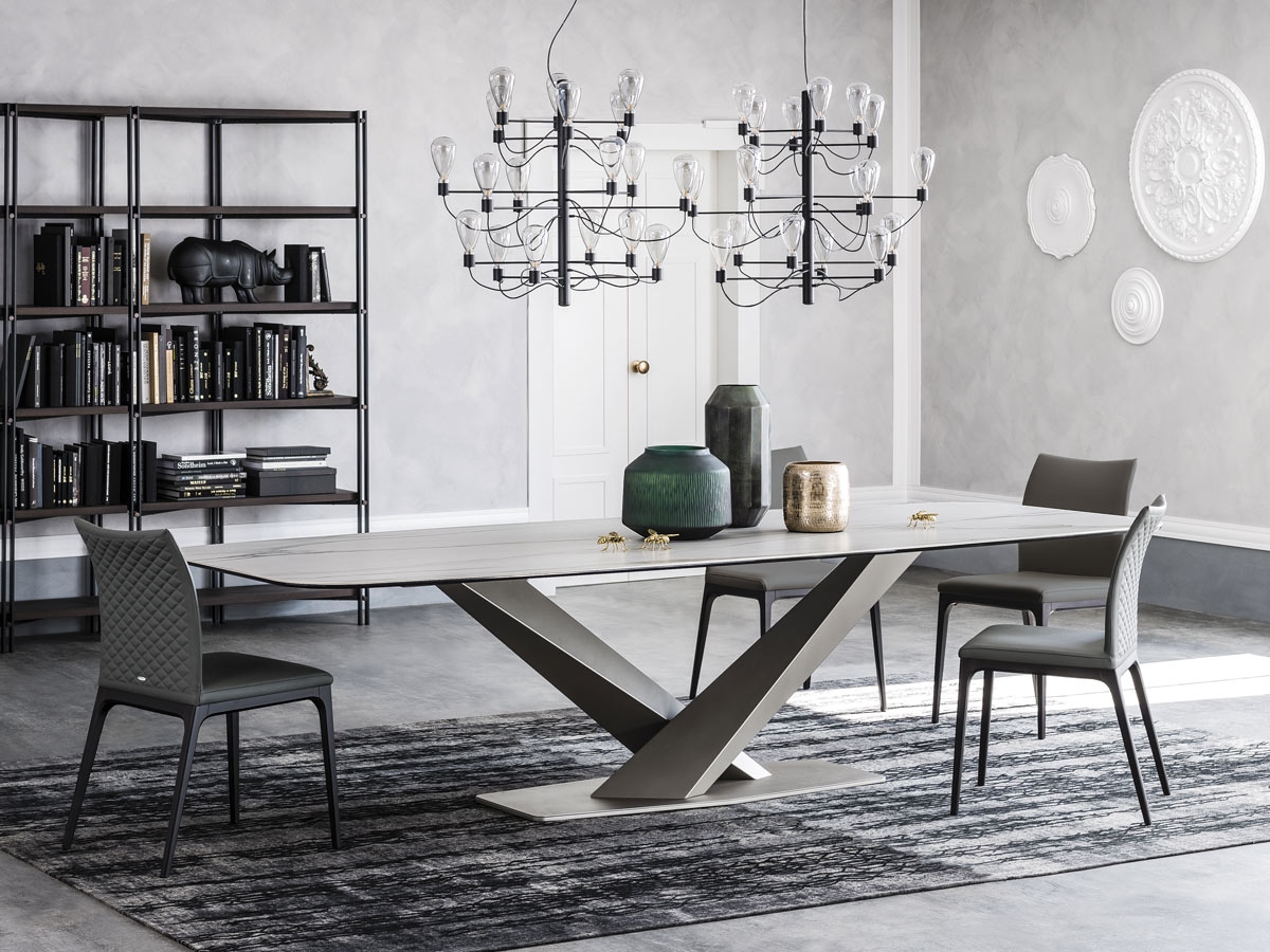 Stratos Keramik by Cattelan is a modern table with an elegant and refined design. It has a steel base made from two angular and bright X shapes and a ceramic Marmi top. Available in different finishes and sizes. It is possible to have it also in the Premium version. Contact us for more information and a special quote.