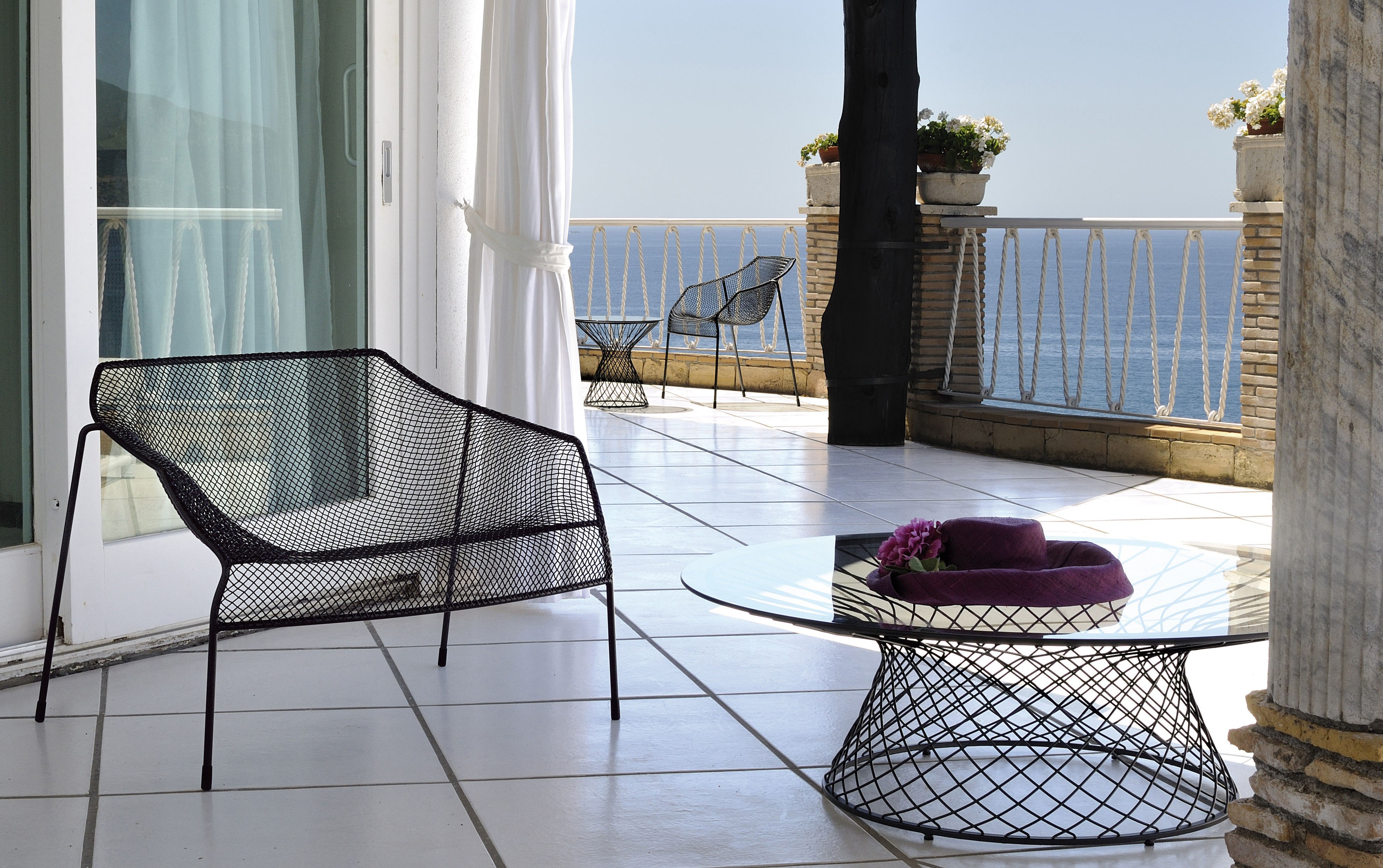 El contraste entre el marco de acero labrado y la ligereza de las líneas, hace de este sillón un mueble versátil y adecuado para cualquier tipo de espacio.