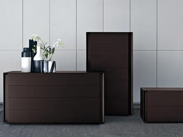 La cómoda baja Luna tiene líneas puras que permiten que el mueble de noche amueble tu zona de descanso con una sobriedad que la distingue, enriquecida por ligeras incisiones laterales en el frente.