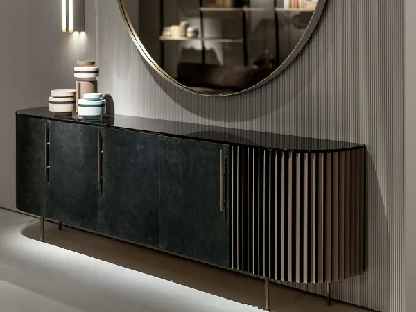 Realizado por Draga & Aurel, el aparador Plissé de Baxter se caracteriza por una estructura de cuero, disponible en dos tipos diferentes de cuero o color. Plissé es un aparador, además, también disponible en dos tamaños diferentes en la versión baja, así como un mueble TV y mueble bar alto.