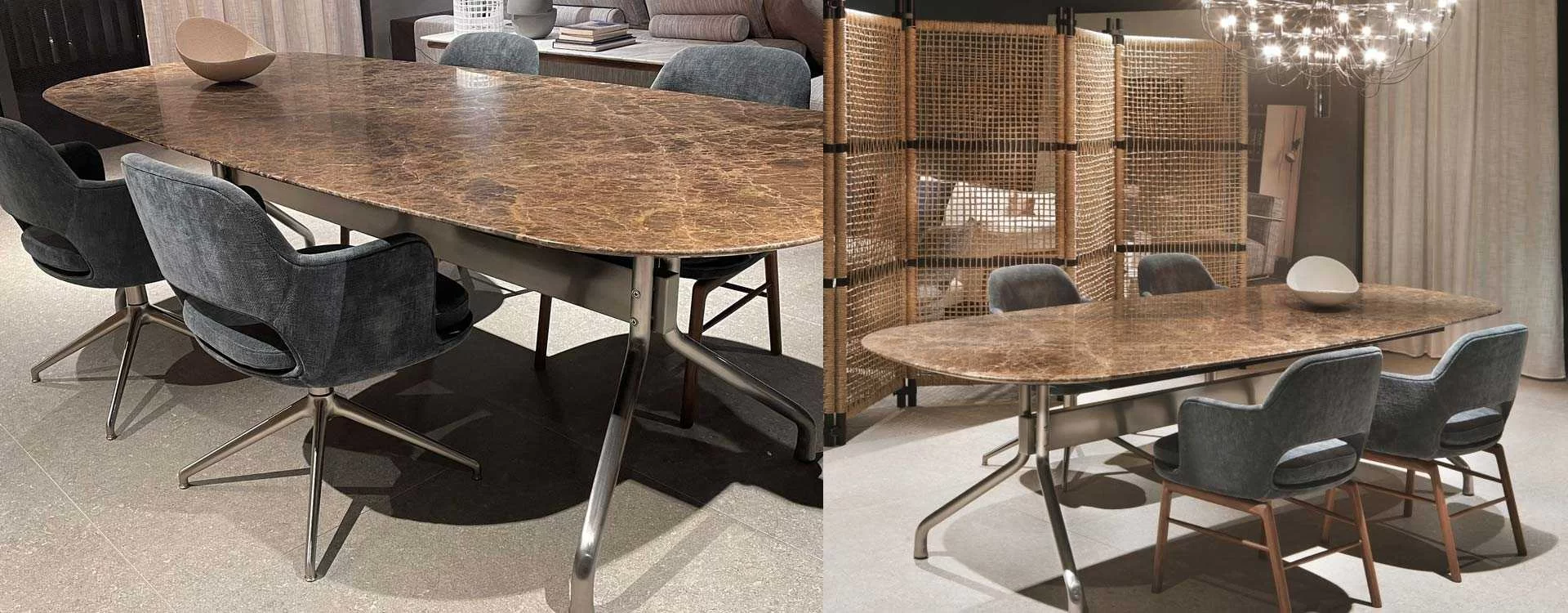 La colección 2022 de Flexform no se limita a los sofás, aunque sean el buque insignia de la empresa italiana. Las nuevas e interesantes propuestas de diseño interior también afectan a la zona de comedor, con la nueva mesa Academy. ¿Su principal característica? El equilibrio perfecto entre elegancia discreta y practicidad, fácil de colocar en los entornos más diversos. Lo que hace que esta mesa sea única es la base con patas de acero de forma sinuosa que soportan el tablero redondeado.