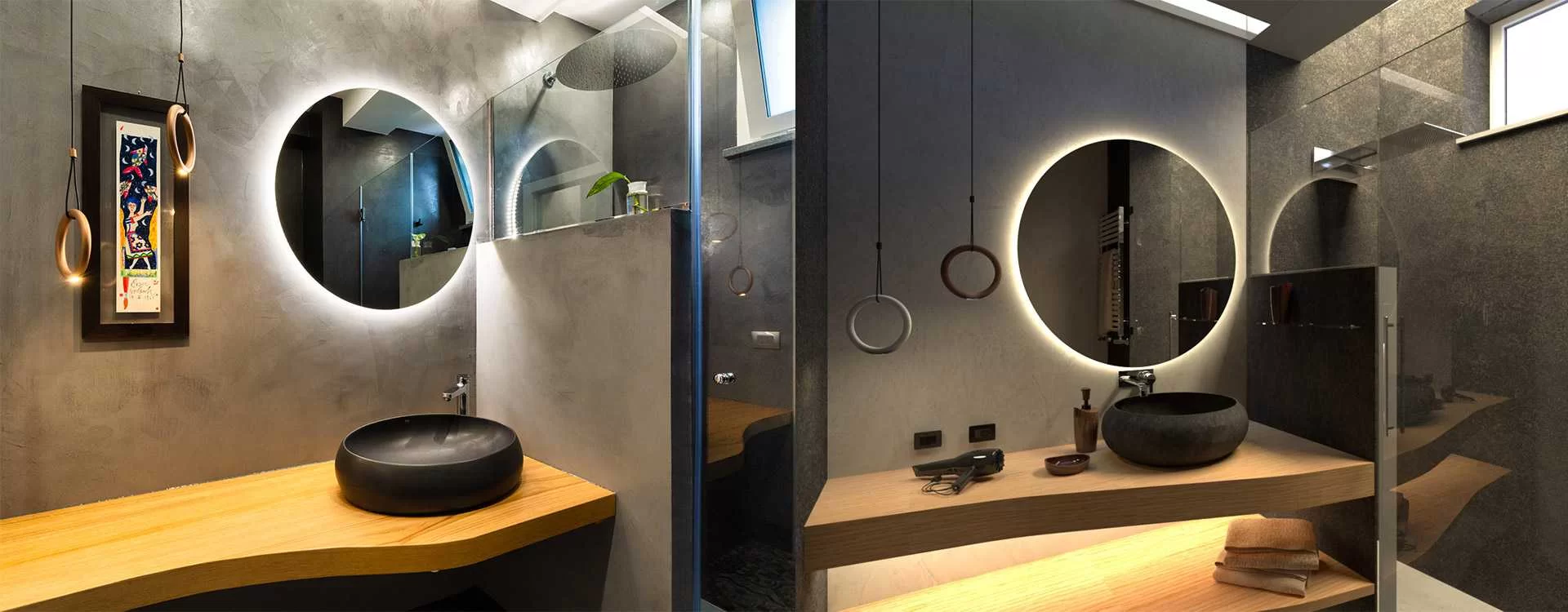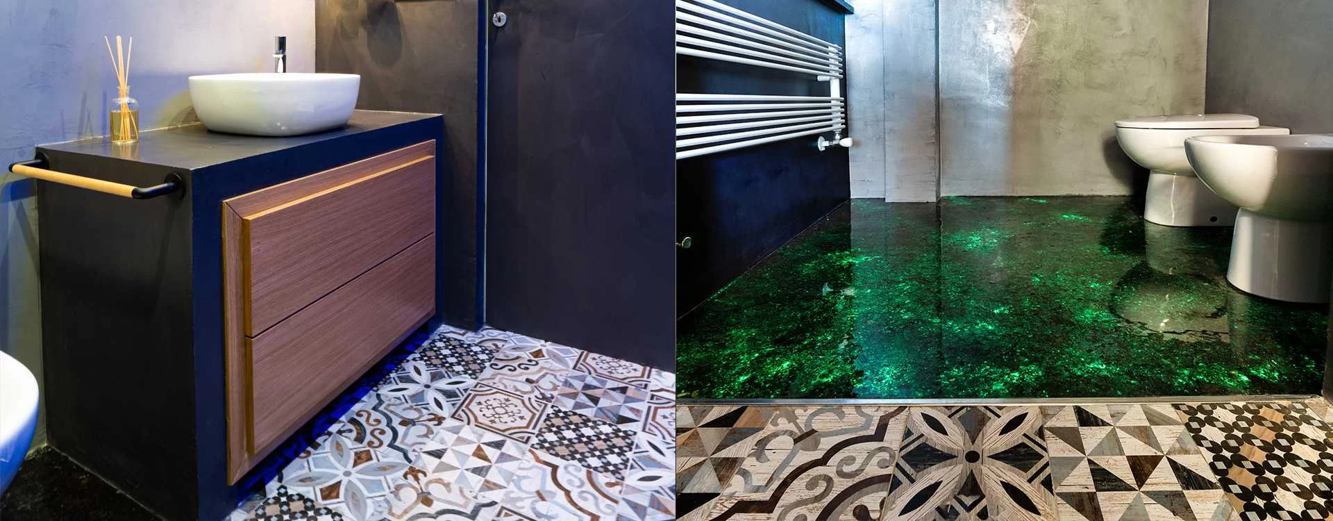 Los cuartos de baño, cuidadosamente diseñados también mediante renders de estudio fielmente reproducidos en la realidad, se cubrieron por completo con resina de dos colores diferentes a la que se añadió polvo de Swarovski. Para los suelos, un patchwork y, en parte, pero sólo en el cuarto de baño principal, piedras de lava con polvo de fósforo recubiertas después de resina transparente para un efecto parecido al de la "kriptonita" cuando se apagan las luces.