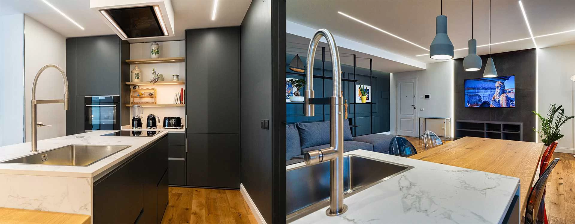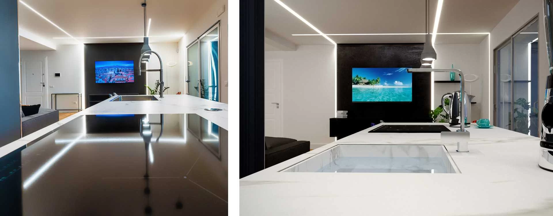 "El resultado final es un espacio abierto delicado, casi minimalista. Suelo de parqué y dos colores en las paredes, un gris (idéntico al acabado de la cocina) que mira desde el mar hacia la tierra y un blanco que mira desde el lado opuesto. Las grandes baldosas oscuras de 120x120 'retenidas' por los efectos luminosos de las tiras de iluminación LED de alta eficiencia sirven de telón de fondo al televisor", explica el arquitecto.