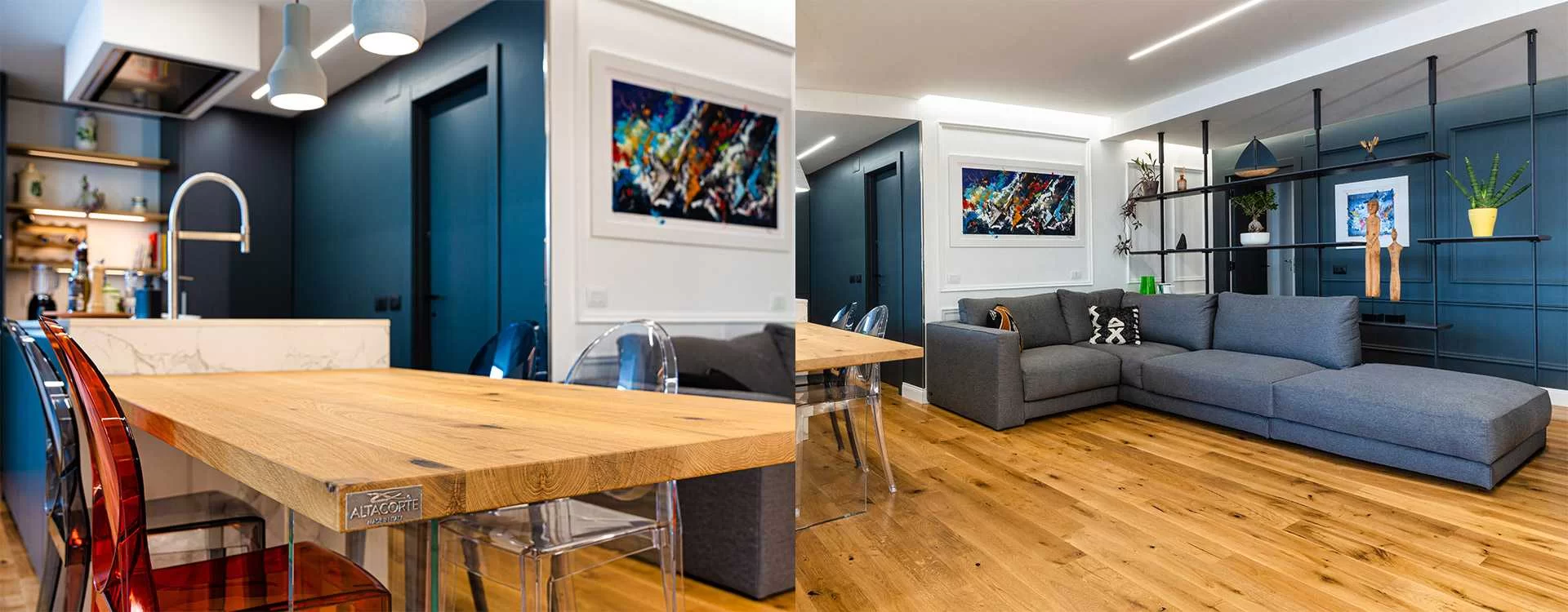 "Todo se enriquece con la explosión de colores de los barcos en regata pintados por el Maestro Siciliano Francesco Toraldo, insertados en los espacios dentro de los marcos de yeso de las paredes. Temas que tienen un significado realmente importante, ya que se trata de la casa de un marinero y la casa, lo sabemos, debe reflejar siempre a quienes viven en ella. "Estos colores que salen de los marcos dieron la idea para la elección de sillas transparentes de diferentes colores alrededor de la mesa del comedor".