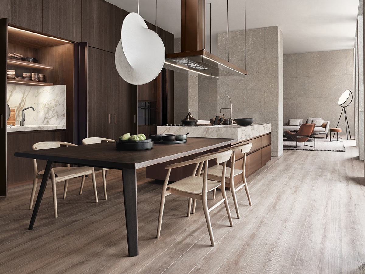 Convivium se caracteriza por su isla de trabajo conectada a una mesa de generosas dimensiones. Además, Convivium dispone de una pared dedicada a la despensa y al almacenamiento de vajilla y herramientas.